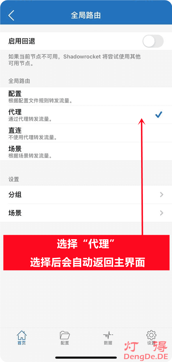 (9)在【全局路由】界面,我们点击勾选“代理”模式,然后会自动返回Shadowrocket主界面。