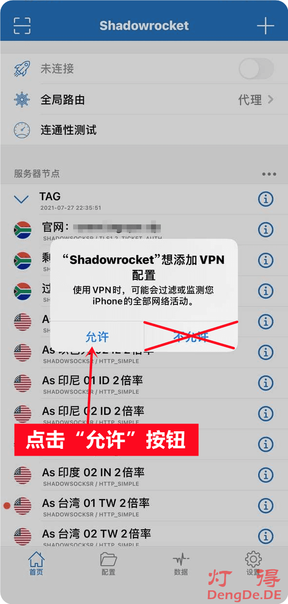 如果我们是第一次使用Shadowrocket,会弹出想要添加VPN配置的请求窗口,我们点击”允许“按钮即可。