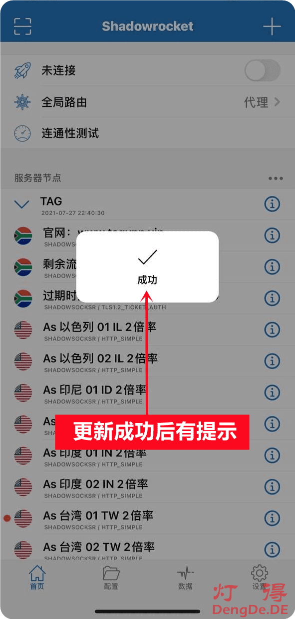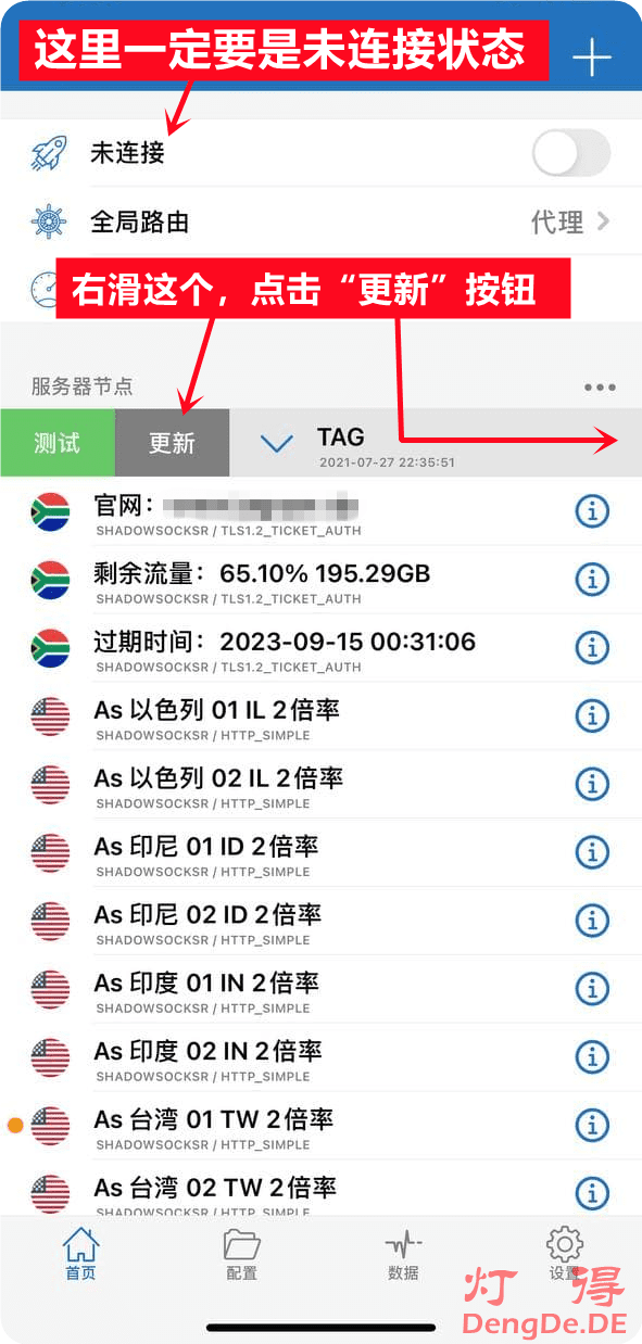 当我们更新Shadowrocket订阅时,一定要处于“未连接”状态,因为链接状态下更新可能会失败。我们右滑订阅名称(这里以“TAG”进行演示,点击“更新”按钮)即可完成。