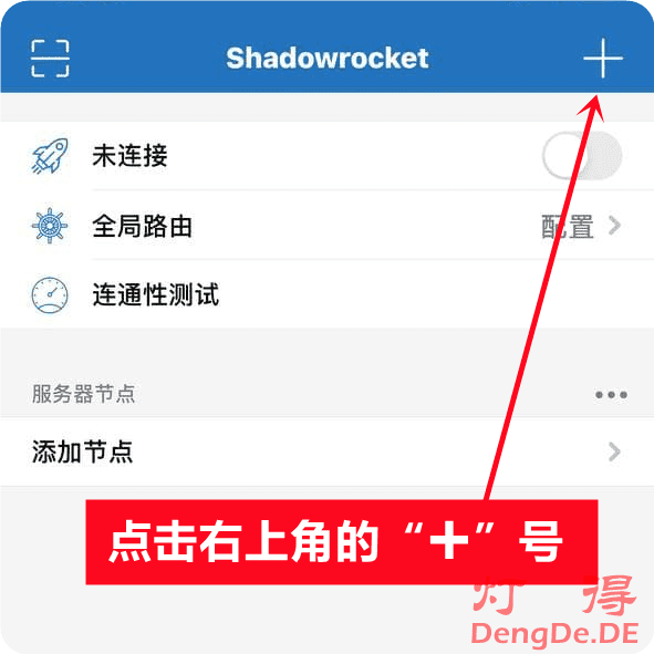 (1)安装并打开Shadowrocket后,我们点击右上角的“➕”号图标,进入【添加节点】界面。