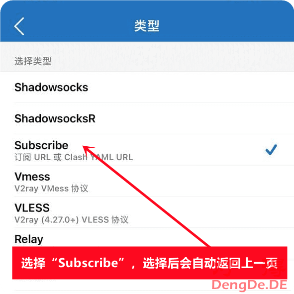 (3)选择“Subscribe”也就是“订阅”的意思,选择后会自动返回上一页。如果你有单节点,也可以选择对应的科学上网协议类型。