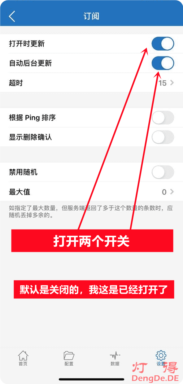(7)在Shadowrocket订阅设置界面,我们同时开启”打开时更新“和”自动后台更新“两个按钮。