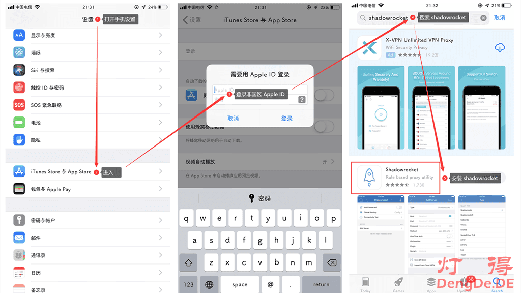 设置->iTunes Store 与 App Store->使用非国区 Apple ID登录,登录成功后 App Store 会自动切换成对应的语言,在搜索框输入Shadowrocket进行获取,付费购买后下载安装。 - 当Shadowrocket安装好并正常打开App后,务必退出 Apple ID。具体操作步骤:打开iPhone手机,依次点击:
