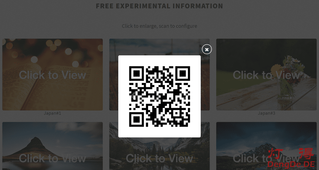 打开FreeSS网站,点击顶部菜单“Free”,或继续往下面翻页,会自动转到“FREE EXPERIMENTAL INFORMATION”位置处,然后点击任何一张图片即可弹出免费SS节点二维码,如下图所示: